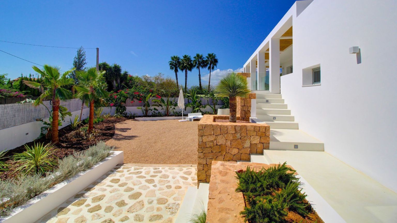 El diseño de este jardín responde a las condiciones específicas del clima ibicenco, donde el sol intenso marca el ritmo de la vida exterior. Aprovechamos la luz natural para crear un espacio que es tanto funcional como estéticamente atractivo, utilizando especies resistentes como las estipas, que añaden movimiento y textura al paisaje.